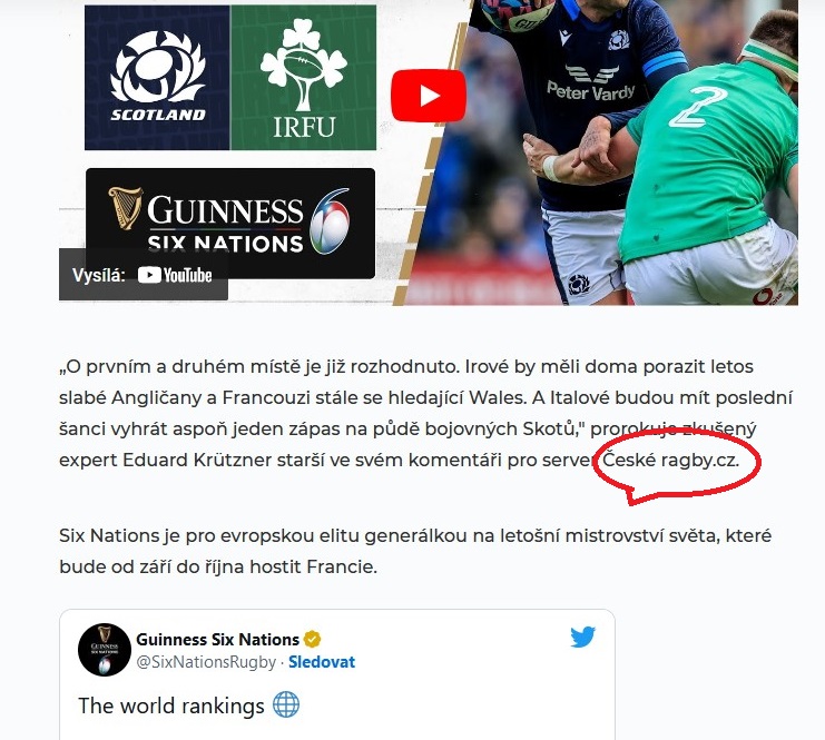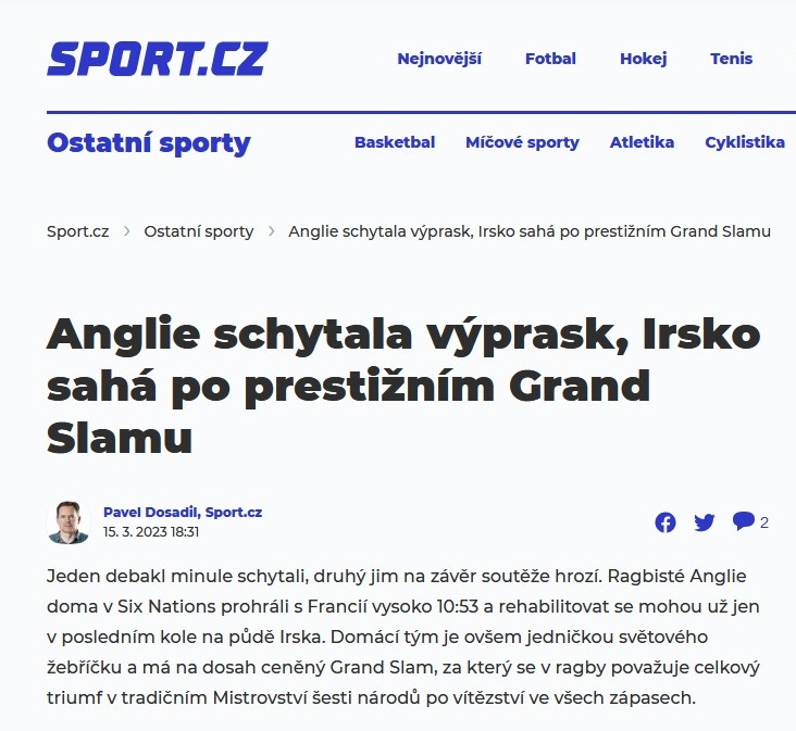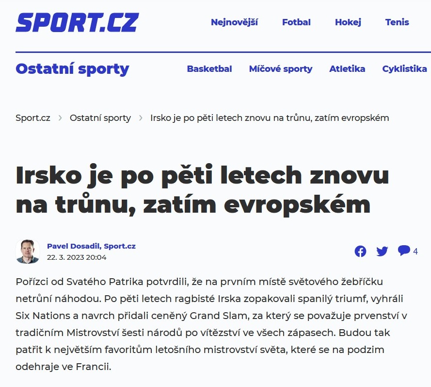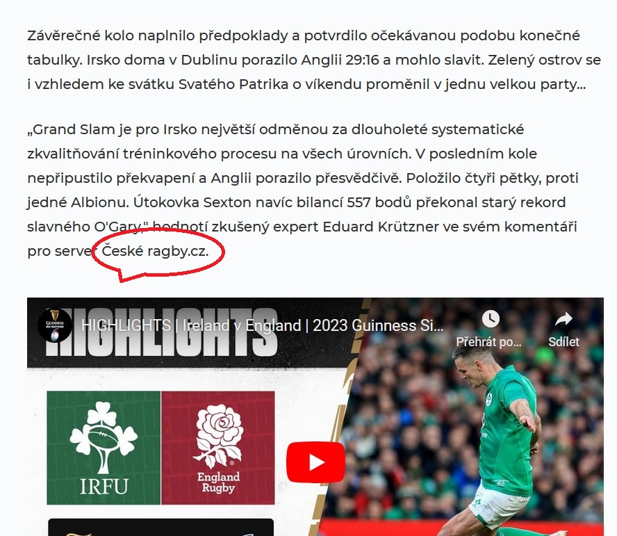 V březnu 2023 vyšlo v médiích velmi mnoho, jak Slováci říkají neúrekom, článků, ve kterých autoři převzali nebo citovali z alternativního ragbyového magazínu Ceskeragby.cz. Tento web, jak možná nevíte, funguje jen na základě dobrovolného tedy neplaceného nadšení zato za každodenní několikahodinové profesionální práce počínaje sportovními publicisty, přes skvělé fotografy až po legendární ragbyové znalce a komentátory. Inu, kdo to má!!! Ceskeragby.cz !!!