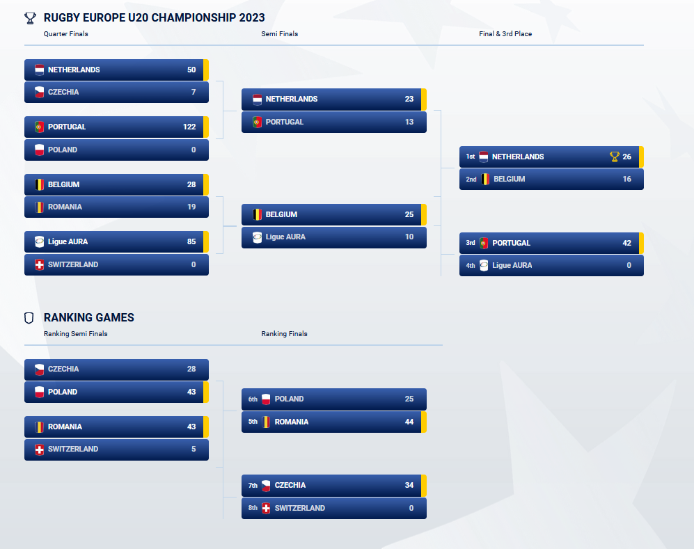 Poznámka: Konečné pořadí z Championship 2023 U20, ve kterém se Česko umístilo na šestém místě, bohužel není skutečným žebříčkem nejlepších evropských reprezentačních týmů v této věkové kategorii, neboť dvacetileté mnohem silnější reprezentace Francie, Anglie, Walesu, Skotska, Irska a Itálie hrají jinou soutěž, která určuje skutečný nejlepší tým Evropy sezóny. Navíc Championship 2023 U20 v Praze se nezúčastnily z vyspělé ragbyové Evropy ještě reprezentační týmy Španělska a Gruzie.