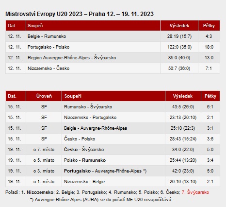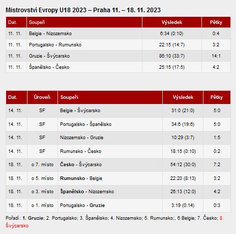 Poznámka: Konečné pořadí z Championship 2023 U18, ve kterém se Česko umístilo na sedmém místě, bohužel není skutečným žebříčkem nejlepších evropských reprezentačních týmů v této věkové kategorii, neboť osmnáctileté mnohem silnější reprezentace Francie, Anglie, Walesu, Skotska, Irska a Itálie hrají uzavřenou soutěž, která určuje skutečný nejlepší tým Evropy sezóny.