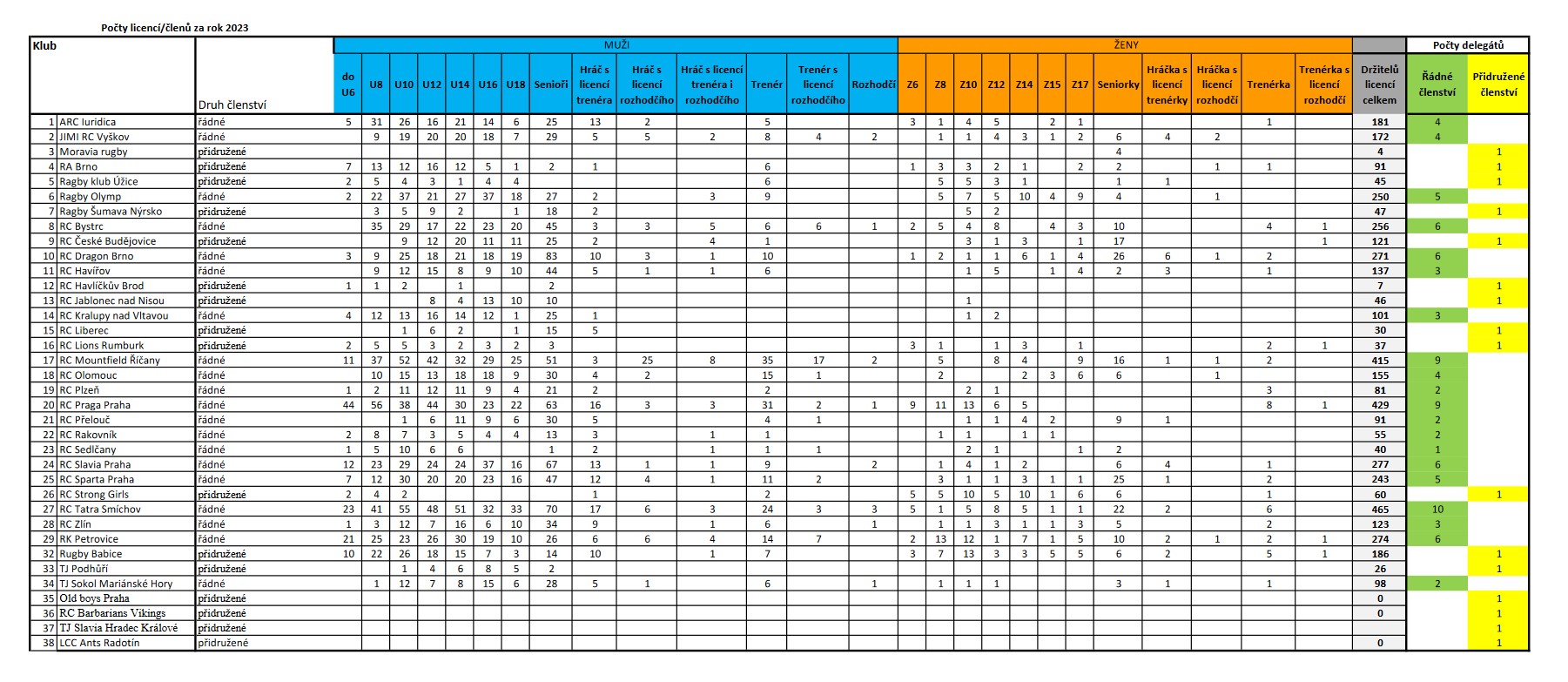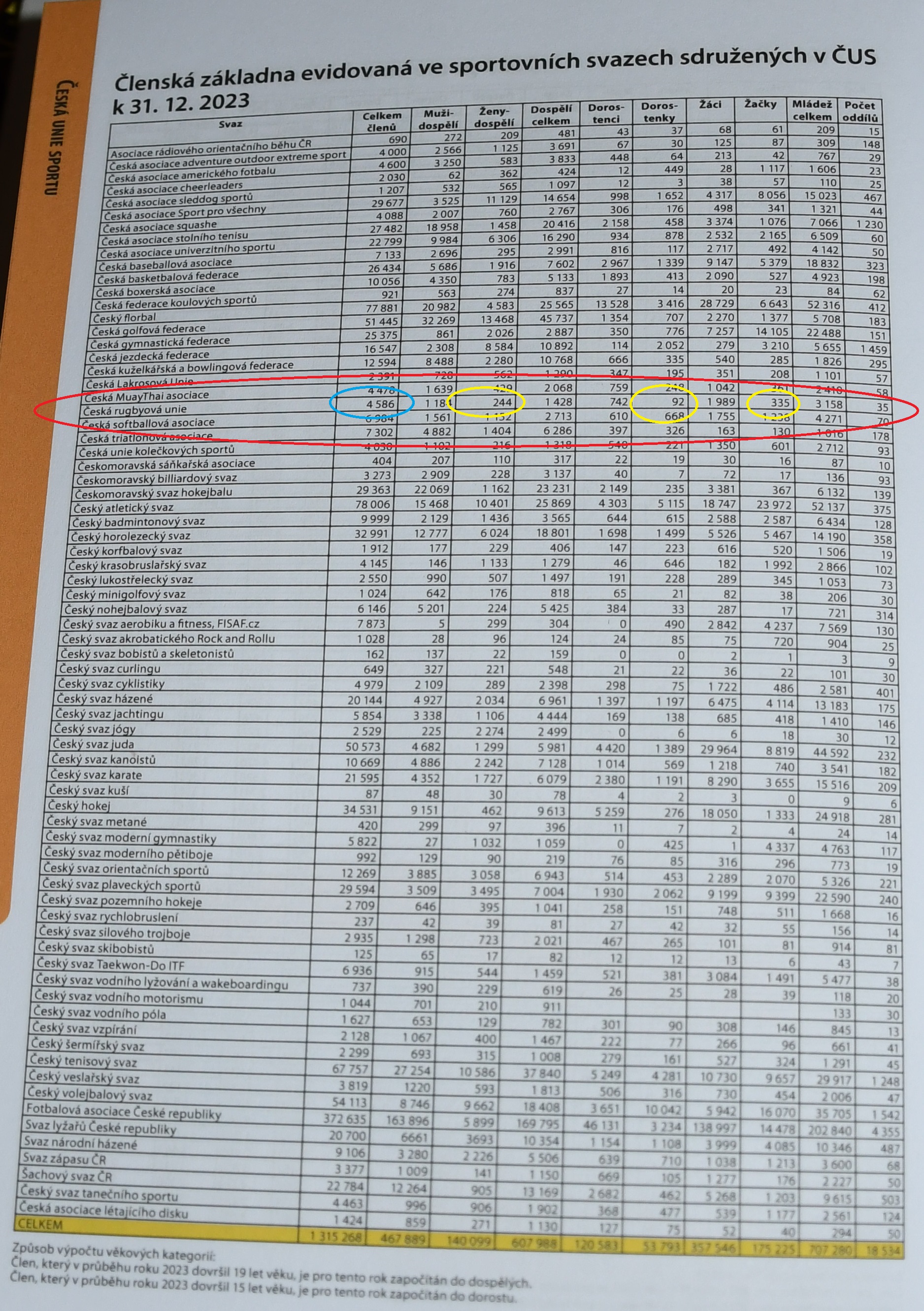 Tabulka o počtu členů a členek České rugbyové unie tak, jak byla čísla uvedena v publikaci Ročenka ČUS 2023 dokazuje, že na jednu ragbistku připadá sedm ragbistů.