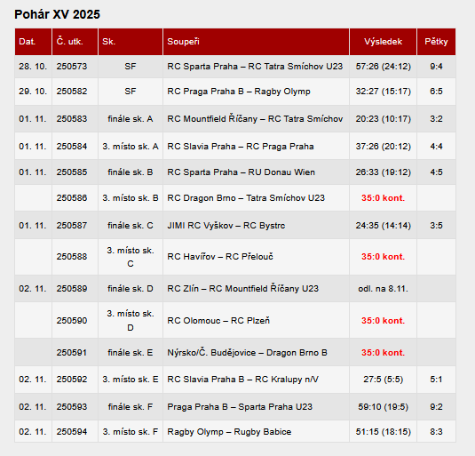 Těžko zjistit, kolik je v Praze příznivců ragby, kteří se odhodlají tento sport sledovat osobně z hledištích ragbyových hřišť, nu a když se utkání posledního hracího víkendu podzimního turnaje stanoví na stejný den 1.listopadu 2025 a dokonce všechny ty důležité duely mají stejné začátky od 14 hodin, tak se ani přibližného počtu nedopočítáme.