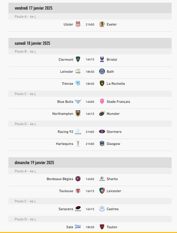 Champions Cup pokračuje o prodlouženém víkendu od pátku 17. ledna 2025 až do neděle 19. ledna 2025 dalšími zápasy, které bude v přímých přenosech vysílat ČT Sport - Plus.