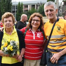 Nejstarší hráč v utkání veteránů, bývalý prezident RC Pragy Praha Zdeněk Žák se svoji barevně sladěnou manželkou, která zdaleka nebyla z oslavujících žen na Pragovce nejstarší