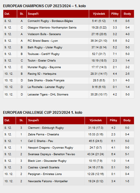 V Evropě byl rozehrán Champions Cup, ve kterém v každé ze čtyř skupin označených písmeny od A až po D startuje šest klubů.