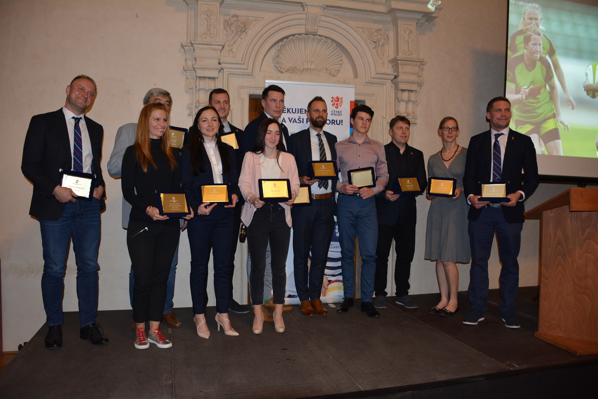 Čeští ragbisté v Praze v Tyršově domě v předvečer mezistátního utkání Česko - Nizozemsko vyhlasili nejlepší ragbisty roku 2018 a další nejlepší v jednotlivých kategoriích.