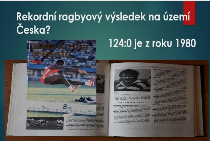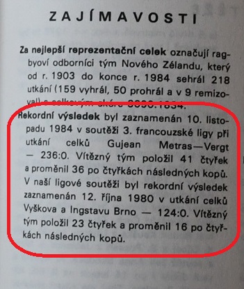 Podle publikace Zlatá kniha rekordů, která vyšla v roce 1987 v nakladatelství Olympia je v kapitole věnované ragby a kterou napsal autor tohoto článku uvedený tuzemský rekordní výsledek z roku 1980. V ligovém utkání odehraném 12. října 1980 Vyškov - Instav Brno 124:0 bylo vítěznými ragbisty položeno 23 čtyřek a proměněných bylo 16 následných kopů po položených čtyřkách. Pokud bychom měli výsledek zápasu, ve kterém se ještě pokládaly čtyřky, porovnávat se současnými výsledky, musíme k číslu 124 připočítat ještě další 23 bodů, což by pak přepočítané skore rekordního výsledku mělo tuto hodnotu 147:0. Pozoruhodné na tom všem není jen vysoké skore, ale i skutečnost, že při vědomí, že se hraje ragby v čase 2 x 40 minut, tak vítězové museli pokládat v utkání odehraném v minulém století každých tři a půl minuty čtyřku.