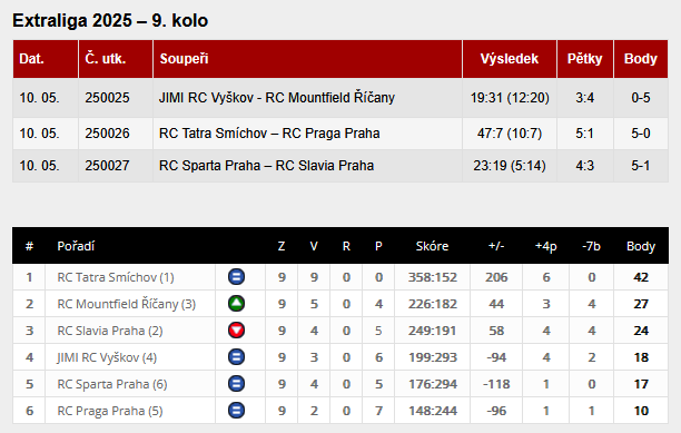 Deváté kolo se hrálo v sobotu 10. května 2025 v Praze na dvou hřištích a v obou případech to bylo pražské derby. Není divu, že