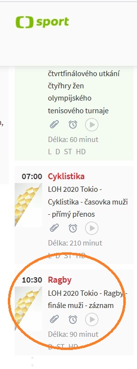 Na poslední chvíli byl upravený program ČT Sport. Ve středu 28. července 2021 bylo ze záznamu zařazeno ragby ... finále olympijských sedmiček mužů.