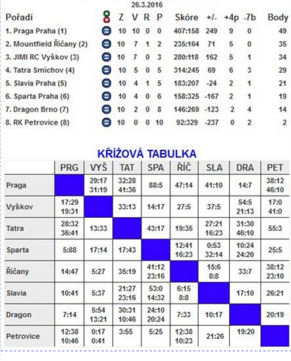 26.3.2016: Extraliga - výsledky,tabulka (10.kolo) Muži 15´