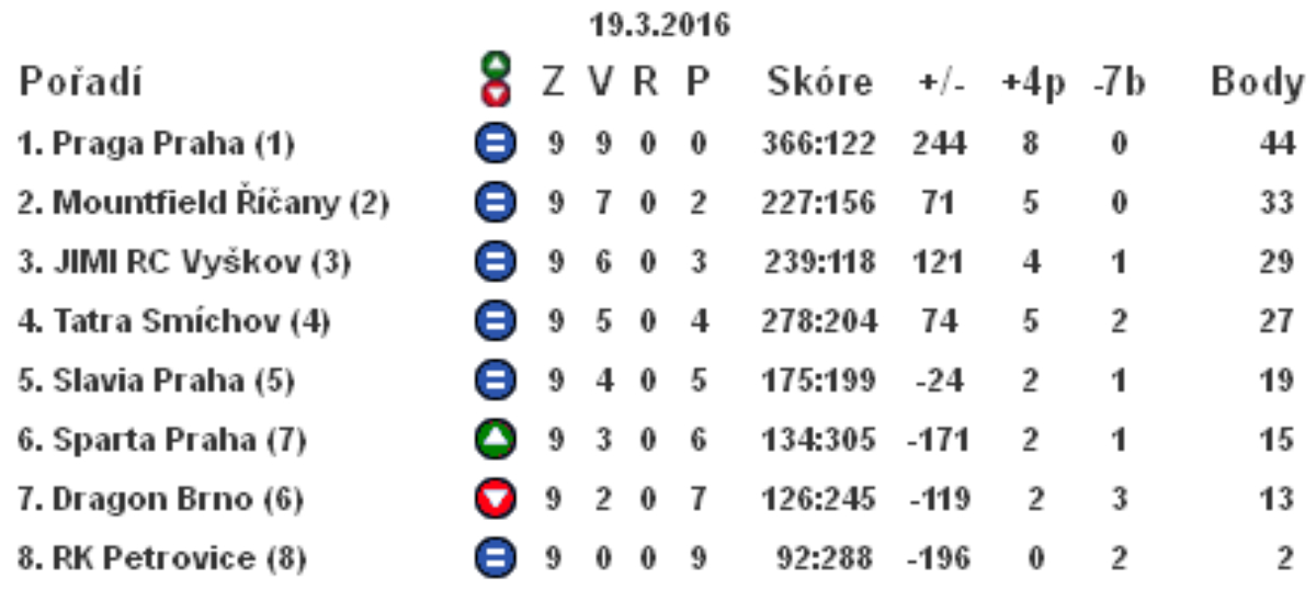 Zrcadlo výsledků dohrávek ragbyové extraligyPRAHA (19.března 2016) Tatra Smíchov - Slavia Praha 16:23 (9:17) pětky 1:2