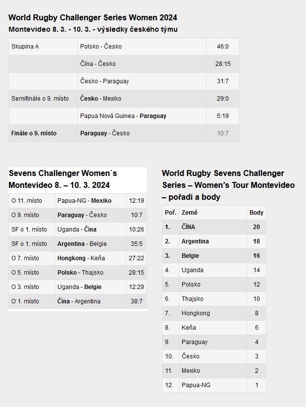 V hlavním městě Uruguaye hrají v soutěži žen české ragbistky, kterým se v pátek 8. března 2024 v prvním hracím dnu moc nedařilo. Ve skupině A Češky nejdříve prohrály s Polskem 0:46 a pak ještě s 15:28 s Čínou. Češky vyhrály až teprve třetí utkání 31:7 s Paraguay druhý hrací den v sobotu 9. března 2024. Češky poté skončily na třetím místě ve skupině A, ale protože ze všech týmů na třetím místě měly lvice nejhorší skore, spadly od skupiny bojující už jen o celkové deváté až dvanácté místo.