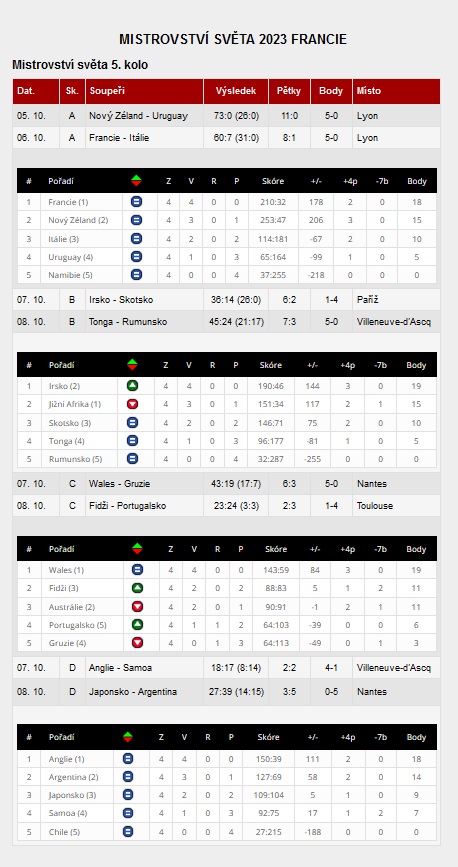 Ve čtvrtfinále se ještě utkají týmy Francie a Jižní Afriky a Irska a Nového Zélandu.
