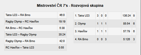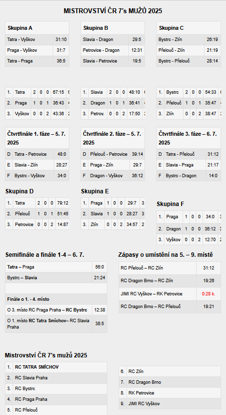 Dvoudenní mistrovský turnaj v ragby o sedmi hráčích vyhráli ragbisté Tatry Smíchov, kteří tak v roce 2025 kromě jedné kategorie vyhráli všechny šampionáty v ragby. Šampionátem mužů v ragbyových sedmičkách, který se uskutečnil ve dnech 5. července a 6. července 2025 v Brně v Bystrci, prošli noví mistři bez porážky. Účastníků šampionátu bylo devět a tato devítka týmů byla rozdělena do tří skupin, z kterých se vytvořily po odehráných utkáních každý s každým ve skupině další tři skupiny a teprve po dalších výsledcích v nově vytvořených skupinách se poté už hrálo o umístění. Favority byly tři ze čtyř pražských sedmičkových kolektivů a to Tatra Smíchov, Slavia Praha, Praga, ale turnaje se zúčastnily i nefavorizované Petrovice, dále na šampionátu startovaly tři moravské týmy Vyškov, Dragon Brno, Brno Bystrc a ještě týmy z regionů mimo Prahu a Brno a to Zlín a Přelouč. Kromě turnaje účastníků mistrovství republiky se během prvního dne hrály ještě zápasy mezi čtyřmi dalšími týmy hrající v rozvojové skupině, do které se přihlásily celky Havířov, Tatra U23, Olymp Praha a Academia Brno.