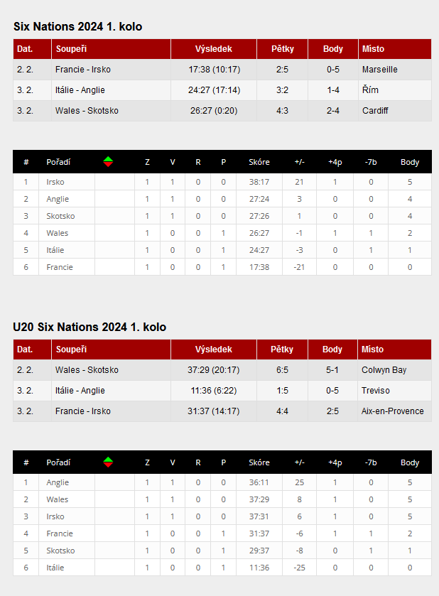 Po prvním kole nejstaršího turnaje na světě v kolektivním sportu, jakým je Pohár šesti národů v ragby, je po utkání Francie - Irsko 17:38 tým Francie na průběžném posledním místě a navíc jako jediný tým v Poháru je bez zisku bodů. Stalo se tak po těsných výsledcích, kterých dosáhly i poražené týmy v dalších zápasech: Itálie - Anglie 24:27 a Wales - Skotsko 26:27, neboť týmy, které prohrají jen o sedm a méně bodů získávají bonusový bod. Poražený Wales v utkání se Skotskem navíc položil čtyři pětky, za což je také jeden bonusový bod navíc a tak má Wales v tabulce dva body. Bonusový bod ke čtyřem za vítězství s Francii získalo i Irsko, které v Marseille položilo pět pětek. Zdá se, že vysoká porážka Francie s Irskem asi rozptýlila úvahy, že by diváci v Marseille zrovna sledovali předčasné finále tohoto ročníku Poháru.