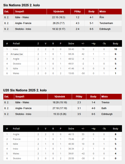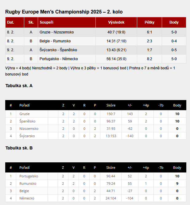 Championat Rugby Europe, pokračoval druhým kolem. Gruzie na svém stadionu porazila snaživé Nizozemce 40:7. Nizozemci se zápas od zápasu lepší, překvapivě neprohrávali mlýny a bojovali až do poslední minuty, což svědčí o jejich dobré fyzičce. Zkušenosti z této náročné soutěže, jsou pro jejich hráče velmi cenné a herní výkonnost, bude mít kladný vliv na ragby v zemi tulipánů. Gruzínští profíci jsou velkým favoritem na postup na Světový pohár 2027 v Austrálii.