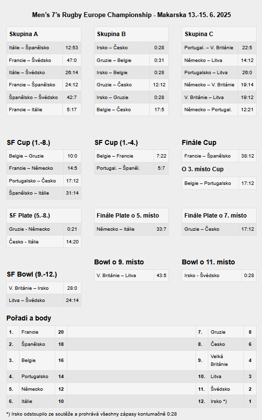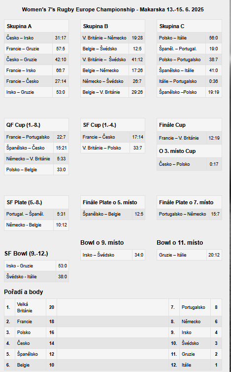 První turnaj mistrovství Evropy mužů i žen v ragby 7 elitní divize Championship se zato zúčastnily obě české reprezentace a nevedly si vůbec špatně. Výběr žen, který trénuje Francouz Lionell Perrin, skončil čtvrtý, když v utkání o třetí místo prohrál po bezbodovém poločase s tradičním soupeřem o bronzové umístění na stupních vítězů s Polskem 0:17. Češky se v základní skupině a pak ještě v semifinále utkaly s účastnicemi olympijského turnaje s Francií, s kterou sice prohrály 27:14 a 17:14, ale zanechaly dobrý dojem, když shodně soupeřkám v obou utkáních nadělily 14 bodů.
