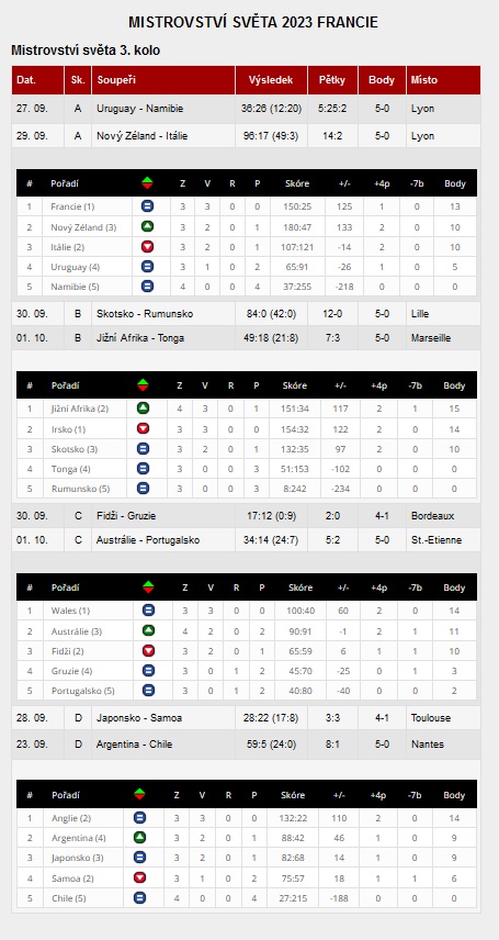 První říjnový týden už bude rozhodnuto, kdo bude hrát v závěrečných zápasech a kdo se vrátí domů. Máme se tedy na co těšit, teď půjde opravdu o všechno a bude záležet na tom, jak osm kvalifikovaných týmů zvládne důležitou psychiku, která je pro úspěšný výkon mužstva tolik důležitá, což jste mohli vidět při sledování utkání Itálie s All Blacks. Světové ragby prokazuje, že je nejlepším a nejférovějším kolektivním sportem na světě," uzvařel svůj komentář pro Ceskeragby.cz Eduard Krützner senior.