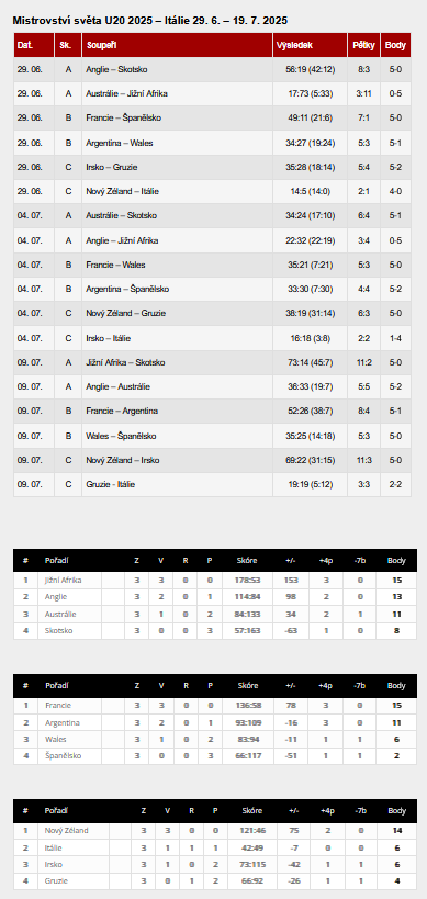 Během třiceti utkání bylo položeno celkem 264 pětek, nejčastěji diváci viděli v sedmi utkáních po osmi položených pětkách . *** Nejvíce 16 pětek bylo položeno v utkání Austrálie - Anglie 68:40, ve kterém také bylo dosaženo nejvíce 108 bodů. Na položené pětky toto utkání skončilo 10:6. *** Největším rozdílem 59 bodů skončilo utkání Jižní Afrika - Skotsko 73:14. *** Nejtěsněji dopadla utkání Gruzie - Itálie 19:19, dále Irsko - Skotsko 21:22 a Španělsko - Irsko 37:38.