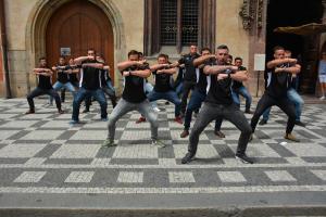 Novozélandští ragbisté vedle orloje předvedenou hakou na chvíli zastavili turistický provoz