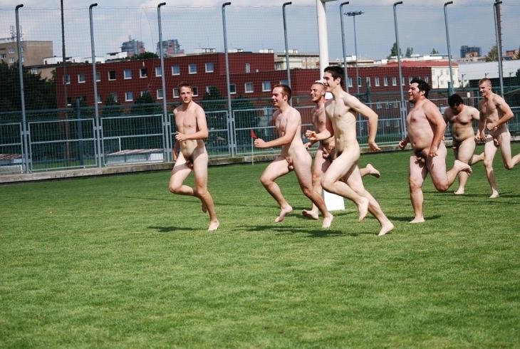 Před koupelí se ještě borci z Lucemburska nazí proběhli po hřišti a tím nalnili sázku.