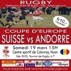 Výkop byl v 15,00 hodin, bohužel začalo pršet, takže celý zápas se odehrál v dešti. Obě mužstva začala opatrně a využívala dlouhých kopů k tomu, že čekala na chyby soupeře. Kopy nebyly příliš taktické a přesné, takže hra byla dosti neurovnaná. Byli to ale Švýcaři, kteří chybovali při zpracování dlouhých kopů a tak se do hry dříve dostali hráči Andorry. Mužstvo Andorry (mají jen jedno) startuje ve Francouzské soutěži „Honneur“ Comité Pyreneje. Bylo na nich vidět, že jsou lépe sehraní a mají zažitý určitý systém, zejména účinného protiútoku, který na Švýcary v prvním poločase platil. Měli několik dobrých akcí, které však nedotáhli k položení pětky. Mají dobrého kopáče (křídlo Abello), který proměnil 2 TK a jeden drop. Švýcaři mají robustní roj, složený většinou ze starších zkušených hráčů, kteří se snažili využít svých předností ve hře v kontaktu, chyběla jim však lepší podpora a tak většina akcí skončila dobrou skládkou Andořanů. V prvním poločase mělo Švýcarsko jen jednu akci útokem, která nakonec skončila předhozem před brankovištěm. Poločas vyzněl jasně pro Andorru, i když vedla jen 9 : 6. Ve druhém poločase Švýcaři méně chybovali a měli tak více míčů, podařilo se jim několik dobrých akcí a dostali Andorru pod tlak. Ta se sice dobře bránila, ale po dobré akci celého útoku, Švýcaři položili k praporku, ale neprokopli. Ujali se vedení a začali si více věřit, po průniku vazače (Lin) a dobré podpory, položili opět pětku, tentokrát pod bránu s prokopem a upravili na 18 : 9. Andorra opět zabojovala, ale dvě pěkné akce útoku s velmi dobrou podporou zadáka, Švýcaři jen s námahou ubránili. Z ojedinělé akce na půli soupeře Švýcaři zvýšili TK na konečných 21 : 9. Andorra útočila až do poslední minuty, když položila u praporku, ale pětka nebyla uznána, protože si hráč šlápl těsně do autu. V obou mužstvech byli nejlepšími hráči vazači za Švýcary Lin (Angličan) za Andorru Kirikashvili (Gruzínec). Podle mého názoru by obě mužstva neměla být pro naši reprezentaci vážným soupeřem. Švýcaři spoléhají spíše na sílu roje, hráči však hodně sólují ,ale chybí jim k tomu potřebná podpora, měli nepřesné auty, mlýny byly vyrovnané. Ve skrumážích byli lepší Andořané, měli rychlejší míče z rucků. Útok děla mnoho technických chyb, hráči jsou často špatně postavení a hrají jen klasické útoky, bez potřebného přečíslení. V obraně byly obě mužstva poměrně dobré, Andorra se snažila využít celé šířky hřiště a hráči o sobě lépe věděli a lépe se podporovali. Deštivé počasí byla pro ně jasná nevýhoda. Švýcaři mají francouzského trenéra Philippa Filiatra, ale na hře to není příliš znát.