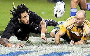 Na úvodní fotografii z utkání Nový Zéland - Austrálie 36:10 (2.8.2008) jsou Ma'a Nonu a Stiring Mortlock. Foto: France Presse
